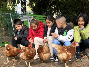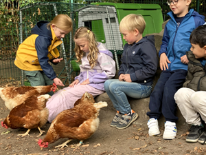 Und er hat einen wirklich nachhaltigen Eindruck bei uns hinterlassen! Denn drei Wochen (Sept./Okt. 2025) lang drehte sich alles um vier muntere Hühnerdamen, die in unseren Schulgarten gezogen waren. Ihren mobilen Hühnerstall (er hieß „Omlet“) hatte der Landwirt aufgebaut, der uns bei diesem schönen Projekt unterstützte. Die ganze Schulgemeinschaft – von den Kindern bis zu den Erwachsenen – empfing die gefiederten Besucher mit großer Begeisterung.