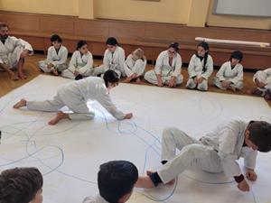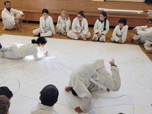 Zur Vorbereitung dieses Erlebnisses nahmen die Klassen 4a und 4b vorher an einem Workshop teil. Wir erprobten zu Musik verschiedene Bewegungen und transportierten sie mit Wachsmalkreiden auf Papier. Beide Klassen konnten am Ende ein großes Gemeinschaftsgemälde bewundern. Die Fotos zeigen einige Eindrücke dieses Workshops.