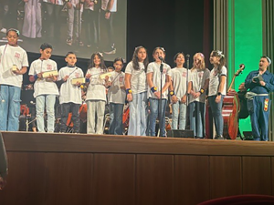 Kinder aus der 4. Klasse haben alle Gäste mit einem Lied musikalisch begrüßt und sich gemeinsam über die Förderung gefreut. Es gibt auch gleich ein paar Ideen, wie das Fördergeld im Ganztag eingesetzt werden kann.