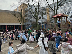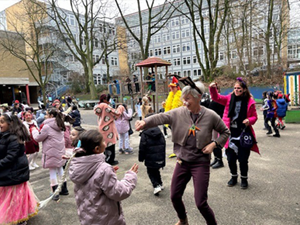 Auch in diesem Jahr wurde mit allen Kindern, Lehrinnen, Erzieher und Erzieherinnen ausgiebig Karneval gefeiert. In der Hofpause hat die gesamte Schulgemeinschaft zusammen getanzt und gelacht. Danach wurde in den Klassen mit Frühstücksbuffet und Spielen weiter gefeiert. Die Kostüme waren bunt und vielfältig, die Erwachsenen haben sich diesmal als Tiere verkleidet.