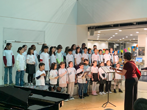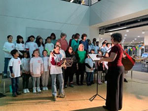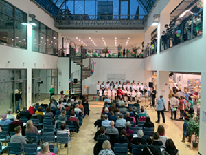 Anlässlich des Tags der Bibliotheken traten am 24.10.2023 die Kinder der Klassen 4a und 4b bei einem gemeinschaftlichen Konzert mit verschiedenen Chören der Folkwang Musikschule in der Zentralbibliothek auf. Unter dem Motto Friedenslieder erfreuten die Kinder zusammen mit Sängerinnen des Chors "Singen macht glücklich" unter Leitung von Ulrike Tervoort mit ihrer Darbietung das Publikums.