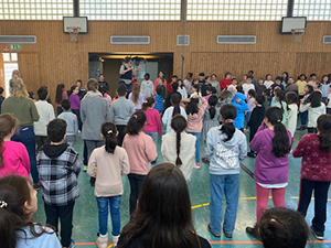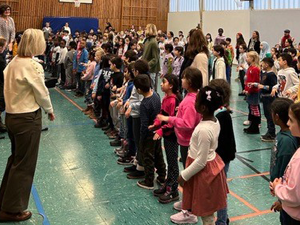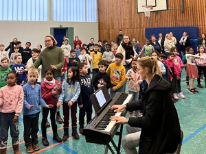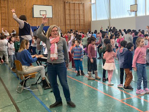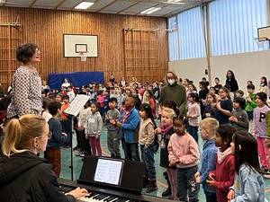 Endlich nach Corona konnte unser tradionelles Schulsingen mit allen Kindern am 28.3.23 in der Turnhalle wieder stattfinden. Die Halle war propevoll und allen hat es viel Spaß gemacht. Folgende Lieder wurden gesungen: Tumbai, Un poquito, Alle Vögel sind schon da, Pack die Badehose ein und zum Abschluss Schallala. Vor den Sommerferien wird es noch ein weiteres Schulsingen geben. Unsere Chorleiterin, Frau Dr. Tervoort, wurde am E-Piano von Frau Yuryeva unterstützt.