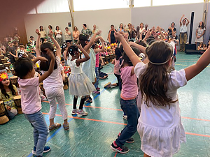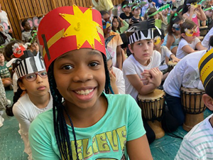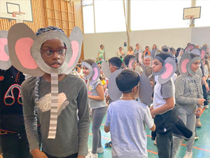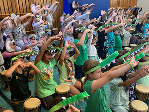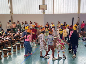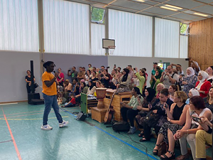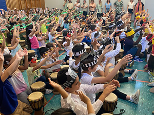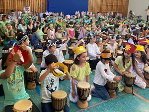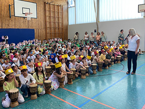 Am 5.9.23 hatten alle unsere Schulkinder einen Trommel-Projekttag an unserer Schule. In der 1. Stunde hat sich der Trommellehrer, Sänger und Tänzer SY aus dem Senegal den Kindern in der Turnhalle vorgestellt. Jedes Kind bekam eine eigene Trommel für den Tag. Sofort wurde ein afrikanisches Lied gelernt. In Jahrgangsgruppen studierten die Kinder in Gruppen Trommellieder. Dabei waren die Kinder als Vögel, Zebras, Sterne, Krokodile und Elefanten verkleidet. Bei einem gemeinsamen Abschluss am Mittag konnten sich die Eltern von den Ergebnissen überzeugen. Wir waren alle begeistert!