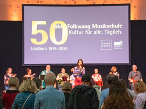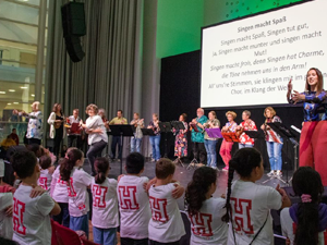 Die Folkwang Musikschule feiert in diesem Jahr ihr 50-jähriges Bestehen. Zu diesem Anlass hat die Musikschule am Samstag, 28.09.2024 in der Essener Philharmonie einen Tag der offenen Türen durchgeführt. Im ganzen Haus konnten die Besucher alle Sparten der Musikschule kennenlernen und sich informieren. Im Bereich Gesang wurde ein Familiensingen veranstaltet. Die Kinder der 4. Klassen der Heinickeschule haben bekannte Kinderlieder vorgetragen und das Publikum durfte kräftig mitsingen. Begleitet wurden die Kinder und Gäste von einer Ukulelengruppe der Folkwang Musikschule. Es war sehr schön, dass wir in diesem besonderen Haus gemeinsam mit den Familien und Gästen singen durften.