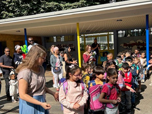 Zum Abschluss wurden die Viertklässler durch ein Spalier aus Kindern der 3. Klassen unter Applaus entlassen. Auf Wiedersehen, liebe 4. Klassen! Wir werden euch vermissen!