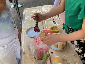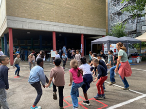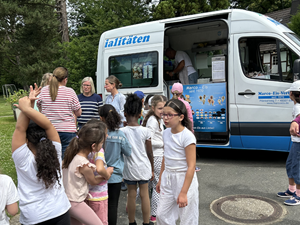 Am Montag haben die Mitarbeiter und Mitarbeiterinnen des FLIZmobils zusammen mit den Schulkindern und Lehrerinnen 8 Häppchenstände mit gesunden Kleinigkeiten und jeweils dazu ein Bewegungs- oder Erlebnisangebot in Form eines Marktes angeboten.