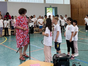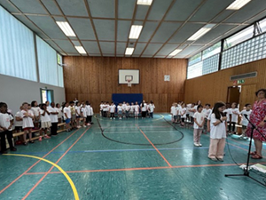 Deshalb haben wir am 03.07.2024 in der Turnhalle ein „Kleines Chorkonzert“ durchgeführt. Die Chorklassen der 3. und 4. Klassen haben einen Ausschnitt aus Ihrem Konzertprogramm vor den 1. und 2. Klassen der Schule präsentiert. Alle haben wunderbar gesungen und es gab reichlich Applaus!