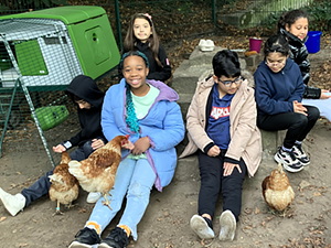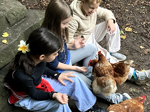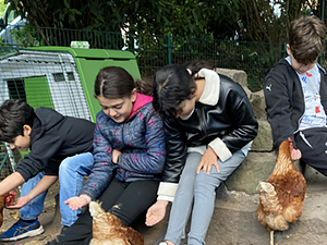 Und er hat einen wirklich nachhaltigen Eindruck bei uns hinterlassen! Denn drei Wochen (Sept./Okt. 2025) lang drehte sich alles um vier muntere Hühnerdamen, die in unseren Schulgarten gezogen waren. Ihren mobilen Hühnerstall (er hieß „Omlet“) hatte der Landwirt aufgebaut, der uns bei diesem schönen Projekt unterstützte. Die ganze Schulgemeinschaft – von den Kindern bis zu den Erwachsenen – empfing die gefiederten Besucher mit großer Begeisterung.