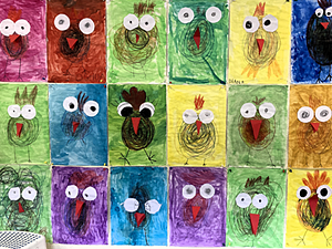 Drei Wochen lang drehte sich bei uns alles um das Federvieh: alle Klassen beschäftigten sich in dieser Zeit ganz unterschiedlich mit ihren Hühnerthemen. Es wurden Hühner-Bilder gemalt oder gestickt, Hühner-Lieder gesungen, und kontinuierlich wurde dabei das Wissen über Mini-Amella, Hanna-Pickie, Linda-Prillan und Kucku-Georgina (sowie all ihre Artgenossinnen) vertieft.