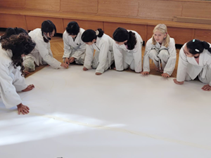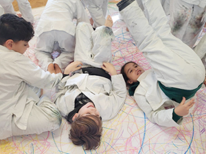 Zur Vorbereitung dieses Erlebnisses nahmen die Klassen 4a und 4b vorher an einem Workshop teil. Wir erprobten zu Musik verschiedene Bewegungen und transportierten sie mit Wachsmalkreiden auf Papier. Beide Klassen konnten am Ende ein großes Gemeinschaftsgemälde bewundern. Die Fotos zeigen einige Eindrücke dieses Workshops.