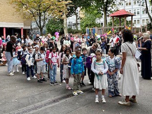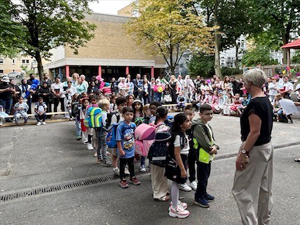 Zum Abschluss wurden die Viertklässler durch ein Spalier aus Kindern der 3. Klassen unter Applaus entlassen. Auf Wiedersehen, liebe 4. Klassen! Wir werden euch vermissen!