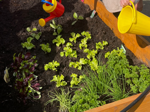 Nun können die Kinder immer wieder beobachten, wie das angepflanzte Obst und Gemüse wächst und gedeiht.