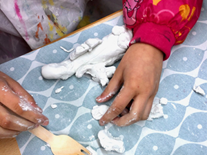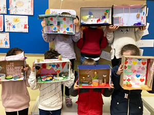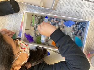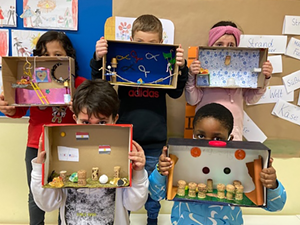 Zuerst wurde die kleine Maus Tillie aus Salzteig geknetet, danach die Welt hinter der Mauer geplant und gezeichnet. Mit besonders viel Eifer, Freude, Fantasie und Geschick ging es dann darum, für Tillie die eigene Fantasiewelt in einen Schuhkarton zu bauen. Eins ist klar: nicht nur Tillie ist begeistert!