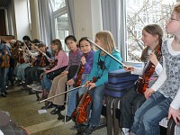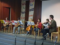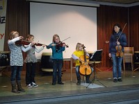 Alle Jeki Gruppen („Jedem Kind ein Instrument“) zeigten tolle Ausschnitte aus ihrer Arbeit. Die Erstklässler sangen und tanzten mit Frau Mallus. Frau Schäfer spielte zusammen mit ihren Geigenschülerinnen und –schülern. Die Gruppe von Herrn Kuhn musizierte auf der Gitarre und sein Ensemble „Kunterbunt“, das sich aus zwei Gitarren (Hanna, Masti), einem Cello (Paula), einem Saxophon (Lina) und einer Geige (Thalida) zusammensetzt, trug „Sascha“ vor. Durch das Programm führte unsere Schulleiterin Frau Warmuth.