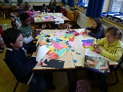 Die Klasse 2b beschäftigte sich mit Werken von Henri Matisse. Die Kinder erstellten Collagen mit wenigen reinen leuchtenden Farben, die miteinander in Beziehung gesetzt werden.