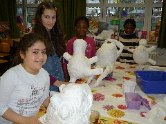 Die Kunstlehrerin Frau Möllmanns hat mit der Klasse 3a seit April mit Speckstein gearbeitet. Damit es nicht so staubte, werkelten die Kinder im Schulgarten. Sie ritzten, bohrten, schleiften und polierten die Steine zu beeindruckenden Kunstwerken, die meist die Form von Tieren wie Pinguinen, Fischen, Schnecken, u.a. bekommen haben. Im Juli konnten alle die eindrucksvolle Ausstellung bewundern.