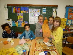 Die Klassen 1a und 1b sahen in der Stadtbibliothek im Rahmen der Essener Märchentage das Handpuppenspiel "Steinsuppe".