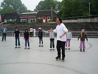 Die erfahrende Rollkunsttrainerin und Deutsche Meisterin Frau Engstfeld betreute die Mädchen liebevoll, gab individuelle Hilfestellungen und ermunterte stets zum Weitermachen. Unser Trainer Herr Schrank überlegte sich verschiedene Übungen und Spiele, um die Fahrpraxis der Kinder zu schulen. Seine kompetente Methodik und Didaktik ließ die schmerzenden Füße vergessen und es wurde viel gelacht. Beide Trainer waren immer selbst auf Rollschuhen neben den Kindern und konnten Figuren perfekt vorzeigen wie z.B. auf einem Bein, Kreise oder Kurven fahren.