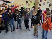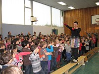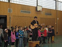 Die Jahrgänge 1 und 2 hatten eine Musikstunde bei den Essener Stadtwerken gewonnen. Der Liedermacher Christian Schigulski und seine Begleitung am Kontrabaß, Caspar van Meel, begeisterten unsere Kinder. Innerhalb kurzer Zeit erlernten sie drei Bewegungs- und Kochlieder, wie z.B. das Lied "Gib mir Fünf". In den nächsten Tagen erhalten die Kinder auch die Kinderkochbücher vom Drachen Dramunkulus.