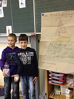 Das Flizmobil des Sozialdienstes katholischer Frauen Essen-Mitte-e.V. führt in unseren Klassen während des ganzen Schuljahres jeden Donnerstag Aktionen und Unterrichtseinheiten zum Thema "Gesunde Ernährung und Bewegungsförderung" durch. Mit Hilfe der Ernährungspyramide ordnen die Kinder Getränke und Lebensmittel ein. Wer die Verpackungsaufschrift genau liest, weiß auch wieviel Zucker in den jeweiligen Lebensmitteln versteckt ist.