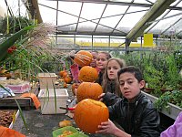 Die Kinder der Klasse 4a haben die Gärtnerei Tebbe besucht und dort aus Kürbissen gruselige Köpfe geschnitzt. Sie verzierten sie mit Naturmaterialien wie Blättern, Kürbiskernen, Blumenzwiebeln, Gräsern und Clematisranken. Zum Abschluss gab es leckere Kürbiswaffeln und Kürbissuppe.