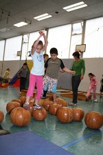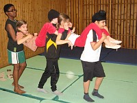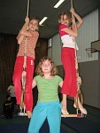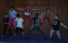 Ganz erstaunliche Kunststücke zeigten die Kinder der 3. und 4. Jahrgänge. Sie teilten sich in verschiedene Gruppen ein und übten zu jonglieren, an den Ringen und dem Trapez zu arbeiten und Menschenpyramiden zu bauen. Die Kinder waren hochmotiviert. Sie gaben einander Hilfestellung, gingen behutsam miteinander um, nahmen die Sicherheitsregeln ernst und fassten Vertrauen zueinander. Die Zeit verging leider viel zu schnell.