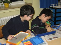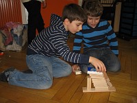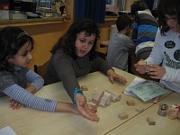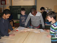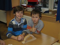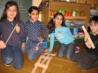 Die Kinder des 2. Jahrgangs bauten während der Projektwoche Brücken aus Holzstäben: Balkenbrücken, Kragbogenbrücken und Bogenbrücken. Das war gar nicht so einfach und erforderte Konzentration, Ausdauer, Geschicklichkeit und Teamarbeit. Zu Recht waren die Kinder ganz stolz, wenn sie eine Brücke solide konstruiert hatten.