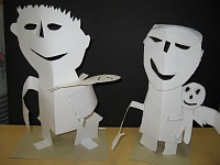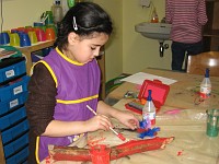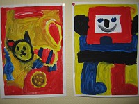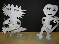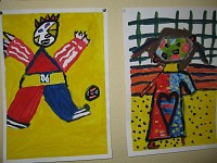 Die Kinder schauten sich Werke von Picasso an und stellten eigene kubistische Kunstwerke her. Sie zeichneten mit Bleistift Gesichter und malten große kubistische Figuren mit Abtönfarben auf Papier. Dann stellten sie mit Hilfe von Cuttern und Scheren Papierskulpturen her. Zwei weitere neue Techniken konnten die Kinder in der Projektwoche erproben: Herstellen von Skulpturen aus Silberdraht und aus Ton.
