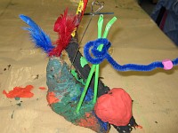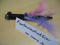 Die Kinder des 2. Jahrgangs sind am ersten Projekttag in den Wald gegangen, um Holz zu sammeln, und zwar Holz, das aussieht wie.... Sie fanden es gar nicht schwer, mit Hilfe ihrer Fantasie Tiere oder andere Wesen zu erkennen. Am zweiten und dritten Tag gestalteten sie ihr Holz. Es kam darauf an, mit Farbe, Federn oder anderem Material das was sie in ihrem Holz sahen, zu unterstreichen. Anschließend schrieben sie eine kleine Geschichte zu ihrem Kunstwerk am PC.