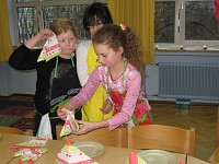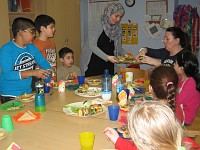 Jedes Kind war abwechselnd für den Bereich Kochen, Spülen und Tisch decken zuständig. Großen Wert wurde auf die gestalterischen Kochkünste gelegt. Viele Kinder werden die Gerichte zu Hause nachkochen. So gut hat es ihnen geschmeckt.