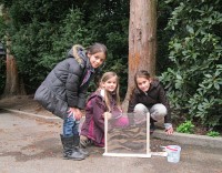 die Kinder mit der Regenwurmwerkstatt, wobei sie experimentieren,