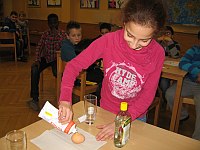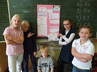 Jetzt wissen alle Schulkinder genau darüber Bescheid wie sie ihre Zähne pflegen und schützen können. Frau Kallmeyer baute an verschiedenen Tagen für die Schulklassen einen Stationsbetrieb auf. Die Viertklässler z.B. lernten ganz anschaulich wie Fluoride die Zähne vor Karies schützen. Die Kalkschale des Eis, das nicht mit einer fluoridhaltigen Paste überzogen war, wurde von der Essigessenz stark angegriffen. Genauso ergeht es unseren Zähnen, wenn wir sie nicht schützen. Die Kinder stellten ihre eigene Zahnpasta her, entwarfen Reklame für ihre Zahnpasta und übten an Modellen das richtige Zähneputzen.