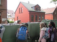Auf ihrem Ausflug in das Rumbachtal in Mülheim-Heißen wanderte die 4a auch auf den Spuren der Steinkohle. In der Bergarbeitersiedlung "Mausegatt" gab es schöne restaurierte Bergarbeiterhäuser zu sehen. Die Kinder erforschten den dort ausgestellten ehemaligen Kohlenzug der Zeche Rosenblumendelle. Er war mit echter Steinkohle gefüllt.