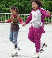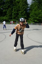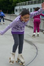Nach einem ein bisschen anstrengenden Aufwärmprogramm ging es auf die Rollschuhbahn. Dort haben wir Figuren, wie z.B. "Eierschneiden"geübt. Einigen Kindern gelang sogar die "Pistole". Das ist beim Rollkunstlauf die Figur: In die Hocke gehen und dann ein Bein nach vorne strecken - und dabei natürlich weiterfahren. Es gab einige Stürze, aber alle Kinder konnten weitermachen.