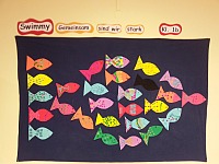In Anlehnung an das Buch „Swimmy“ von Leo Lionni haben die Kinder der 1b ein Gemeinschaftsplakat entworfen, bei dem jedes Kind einen Fisch gestaltete. Die kleinen Fische wurden dann zu einem großen Fisch zusammengefügt.