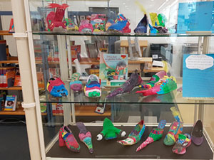 Nachdem die Kinder der 3a das Buch "Irma hat so große Füße" gelesen haben, gestalteten sie in der letzten Projektwoche eigene Schuhe um. Diese kann man nun bis zum 03.05.2019 in der Kinderbuchabteilung der Stadtbücherei besichtigen und bewundern. Hier eine kurze Vorgangsbeschreibung von Tu Linh und Benjamin: Jeder von uns hat einen alten Schuh mitgebracht. Wir haben sie eingekleistert, um die Form zu verändern. Dann hieß es, warten, warten und nochmal warten, bis die Schuhe getrocknet waren. Später malten wir die eingekleisterten Schuhe mit weißer Wandfarbe an und mussten wieder warten. Anschließend malten wir mit Abtönfarbe Muster auf die Schuhe. Zum Schluss haben wir die Schuhe mit Federn, Steinchen und Perlen dekoriert.