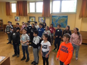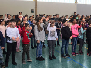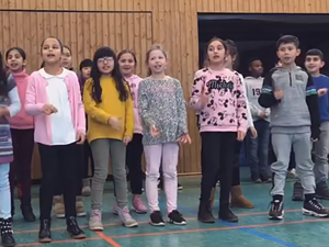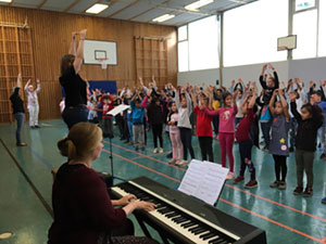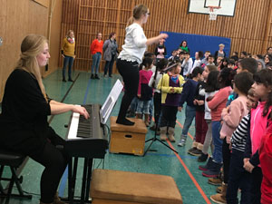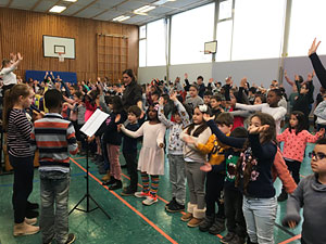 Am Dienstag, den 09.04.19 versammelten sich alle Klassen in der Turnhalle und sangen zusammen unter Anleitung fröhliche Lieder, die die Kinder auch zum Mittanzen eingeladen haben.