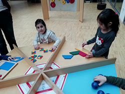 In vielfältiger Weise wurden den Kindern die Grundthemen der Mathematik „Zahlen“, „Formen“ und „Muster“  erfahrbar gemacht. Es warteten viele spannende Experimente auf die Kinder. Am Knobeltisch versuchten sie z.B. eine Kugelpyramide zusammenzubauen und bunt gefärbte Quadrate richtig anzuordnen. Die Kinder fühlten verschiedene Formen, und konnten sich im Spiegelhäuschen unendlich oft sehen. Alle waren mit Eifer dabei!