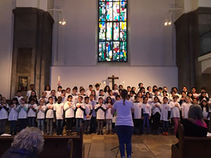 Am Samstag, den 4.5.2019 tagte in Essen an der Folkwang Hochschule der Bundeskongress Deutscher Gesangspädagogen. Unsere Chorleiterin Frau Dr. Ulrike Tervoort hat auf diesem Kongress einen Vortrag zur Chorarbeit an Grundschulen gehalten. Die 4. Klassen der Grundschule an der Heinickestraße durften den Vortrag musikalisch gestalten. Mit den Liedern „Singen ist ne coole Sache“ oder „Sieben Tage Regen“ konnten die Kinder ganz schnell das Publikum für sich gewinnen. Es gab viel Applaus und es musste noch eine Zugabe gesungen werden.